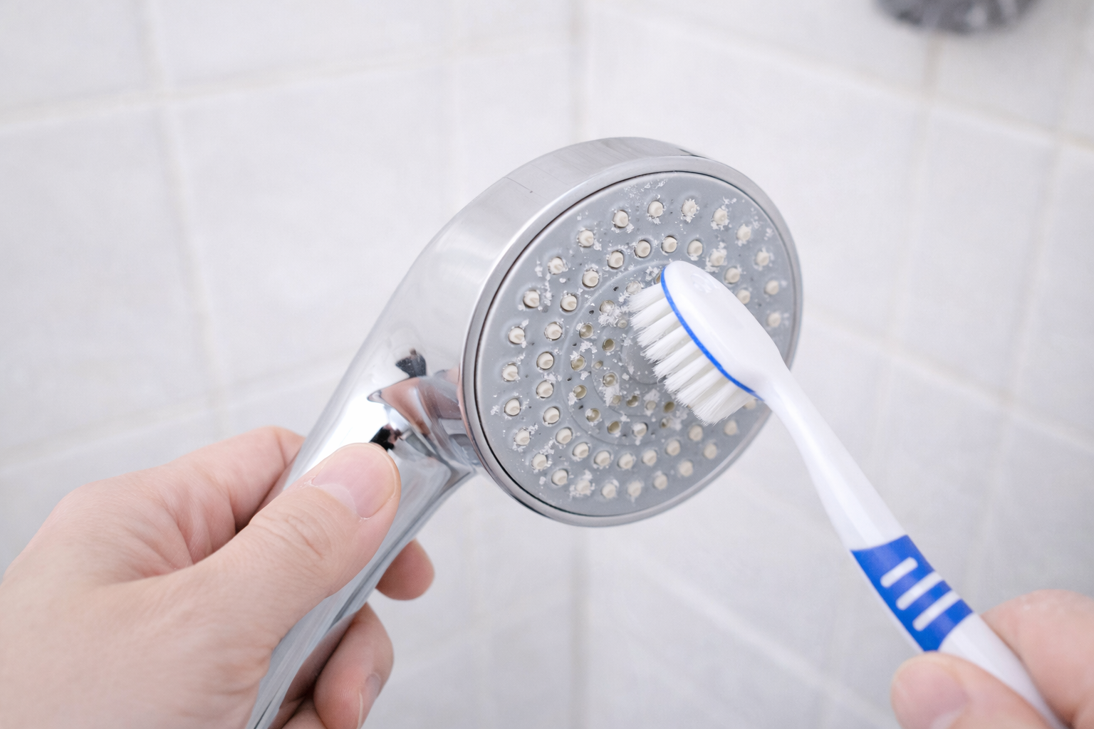 • 헤드를 가까이 보고, 구멍에 하얀 때(석회/물때)나 이물질이 끼어 있지 않은지 봅니다.